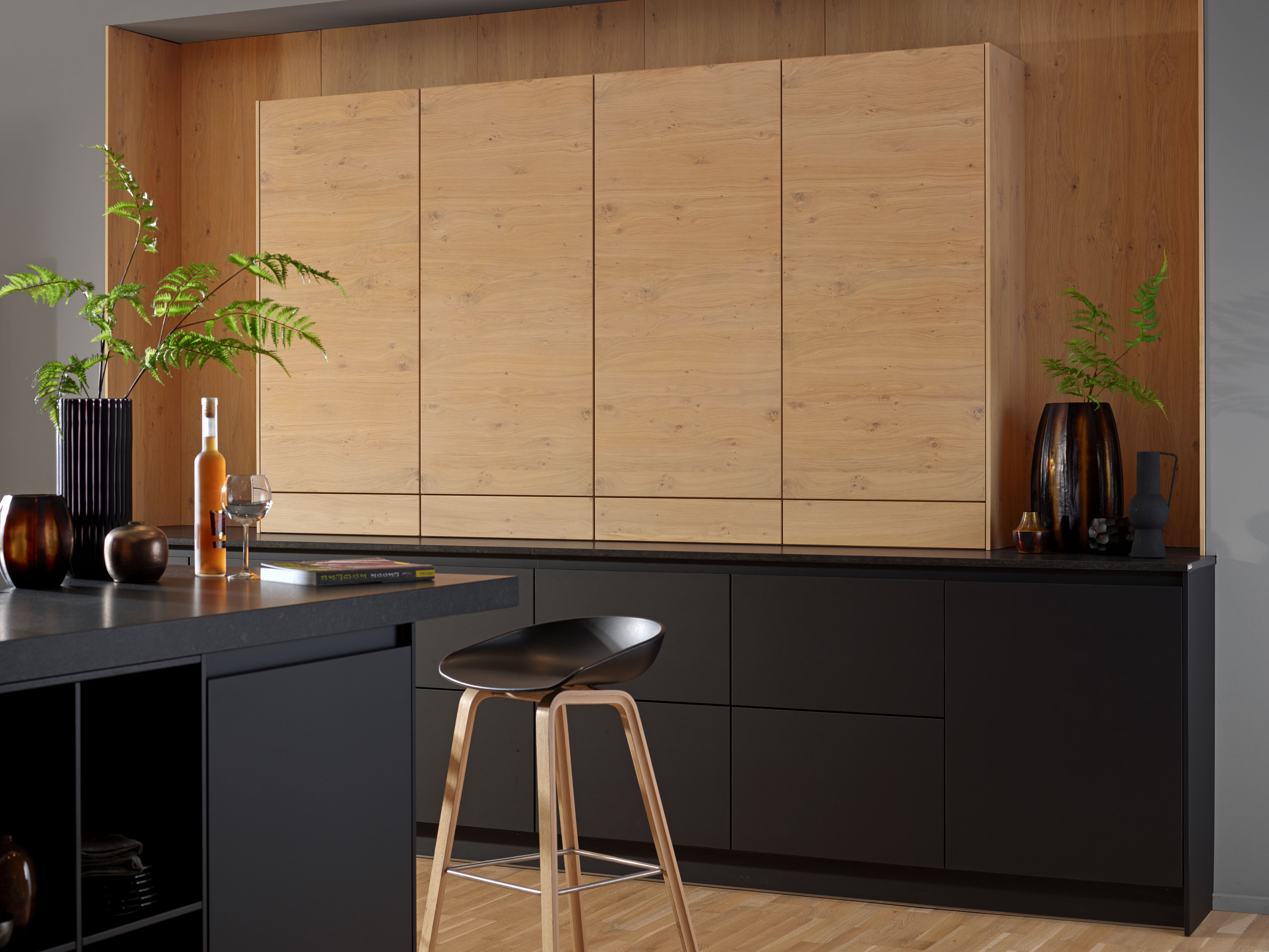 Deze keuken bewijst dat rust en verfijning hand in hand kunnen gaan. De warme houtstructuur brengt een natuurlijk gevoel in de ruimte, terwijl het strakke zwarte lijnenspel zorgt voor een moderne, minimalistische uitstraling. Het resultaat is een keuken die zowel uitnodigend als stijlvol aanvoelt — een plek waar koken en leven samensmelten.